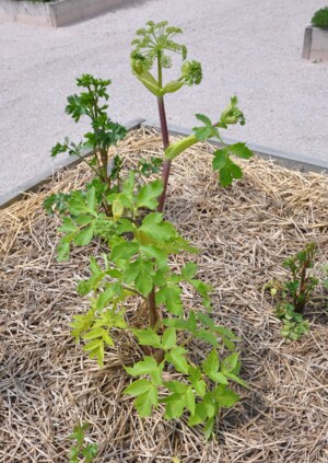 Stručný popis: statná rostlina s hladkou až mírně rýhovanou a dutou lodyhou mající zbarvení do červena, v horní polovině větvenou,okraje lístků pilovité
