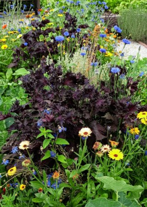 Stručný popis: ve své domovině trvalka, u nás letnička, stonek chlupatý, čtyřhranný, listy zelené až tmavě červené, vstřícné, hrubě pilovité, oválné, 8 cm dlouhé a 6 cm široké, zašpičatělé, řapíkaté