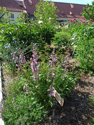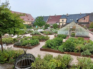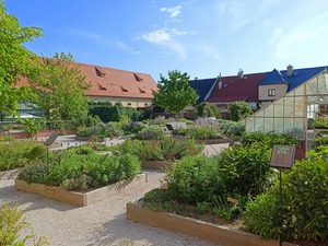 Pohled na biblický záhon, záhon šalvějí, skleník a budovu sv. Damiána