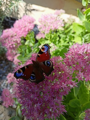 Babočka paví oko odpočívající na rozkvetlém rozchodníku
